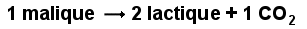 La réalité est évidemment beaucoup plus complexe que le modèle représenté par l'équation ci-dessus. Un grand nombre de produits sont synthétisés au cours de la fermentation, en particulier de l'acide malique dont la présence est souvent (mais pas toujours) ressentie comme un défaut. Pour éliminer l'acide malique, on procède à la fermentation malo-lactique, laquelle transforme l'acide malique en acide lactique :